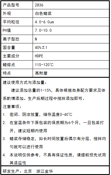 2836水性抗磨蜡浆,采用极硬且高熔点、高密度的聚乙烯和其他高性能原辅材料,根据客户要求,提供3-8μm不同粒径大小,适应各种耐磨耐温要求体系,提供优异的表面爽滑,防粘和抗摩擦效果,稳定性好。
