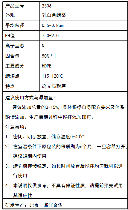 2306是一种专门针对水性涂料体系开发的蜡微分散体,可显著改善涂层的表面性能,提高涂层的耐磨、爽滑、抗粘连等性能。由于0.2-1.0μm的球形分布,对涂层表面的光泽影响小,可用于高光高耐磨水性体系。